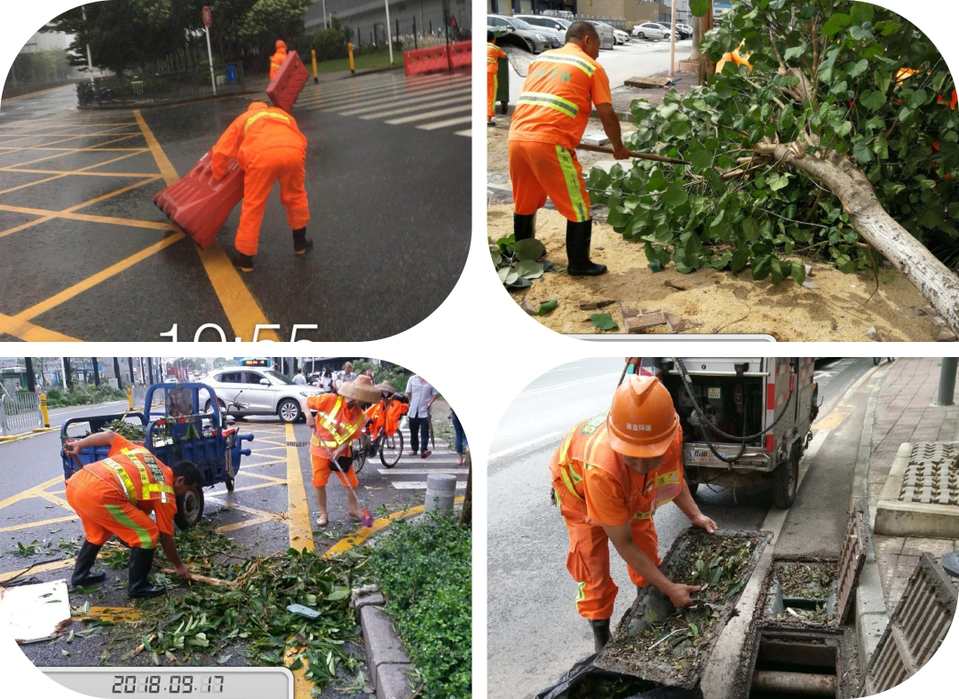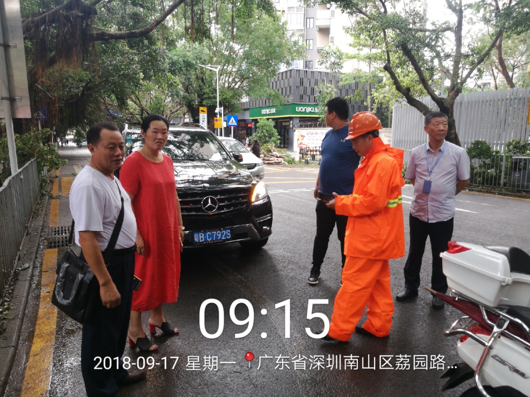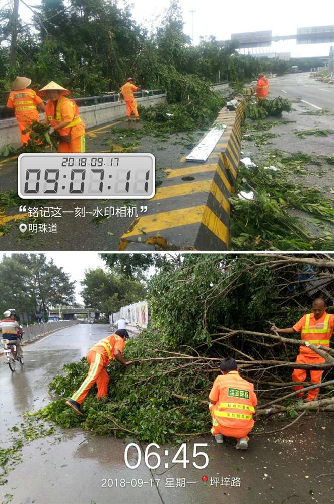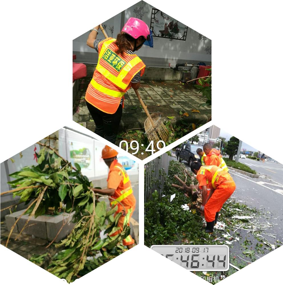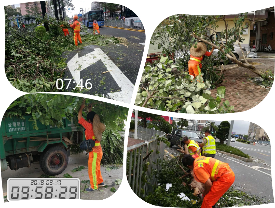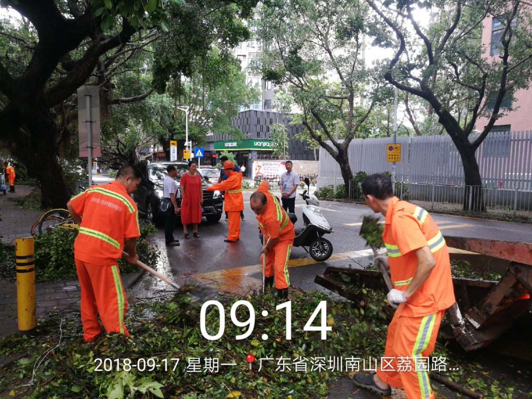 图为台风过后,深圳到处是倒地的树木树枝,及大量的落叶、垃圾,今年会jinnianhui公司深圳各项目员工在现场抢险救灾,清理和疏通道路,第一时间清洁路面情况。 |